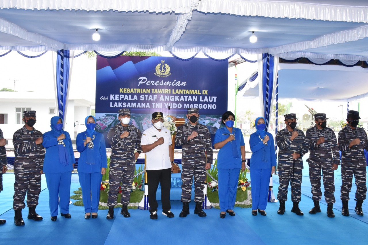 Ambon – Gubernur Maluku Murad Ismail, menghadiri peresmian Sarana dan Prasarana (Sarpras) Kesatrian Tawiri Pangkalan Utama TNI Angkatan Laut (Lantamal) IX, Desa Tawiri, Kecamatan Teluk Ambon, Kota Ambon, Sabtu (19/6/2021). Sarpras Lantamal IX ini, diresmikan Kepala Staf Angkatan Laut (KSAL), Laksamana TNI Yudo Margono.