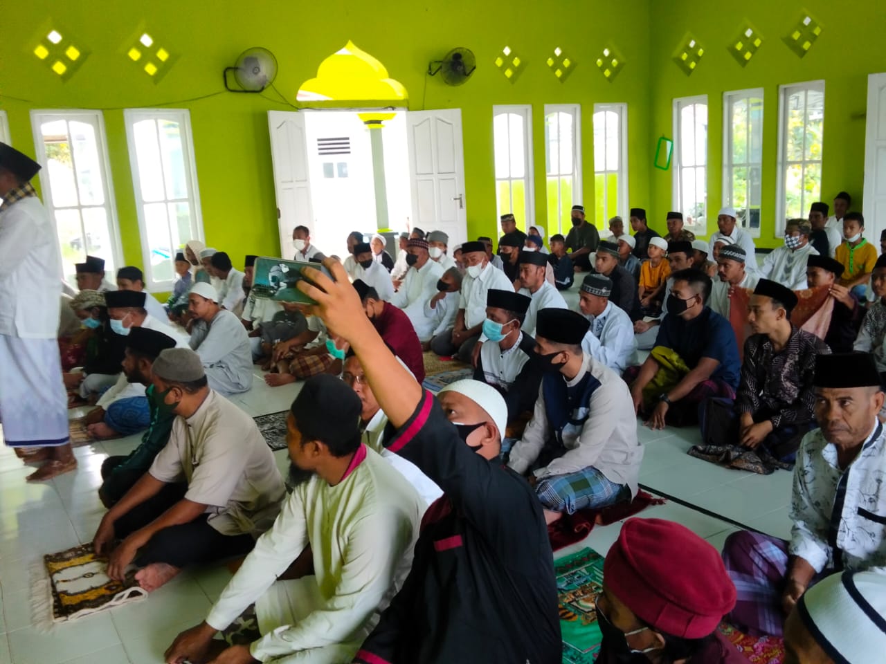 Ratusan jemaah dengan menggunakan masker menghadiri sholat Idul Adha yang dipimpin khotib Al-Ustaz Yahya dan Muazin Sabtu Fokaubun, berjalan aman damai dan khusu.
