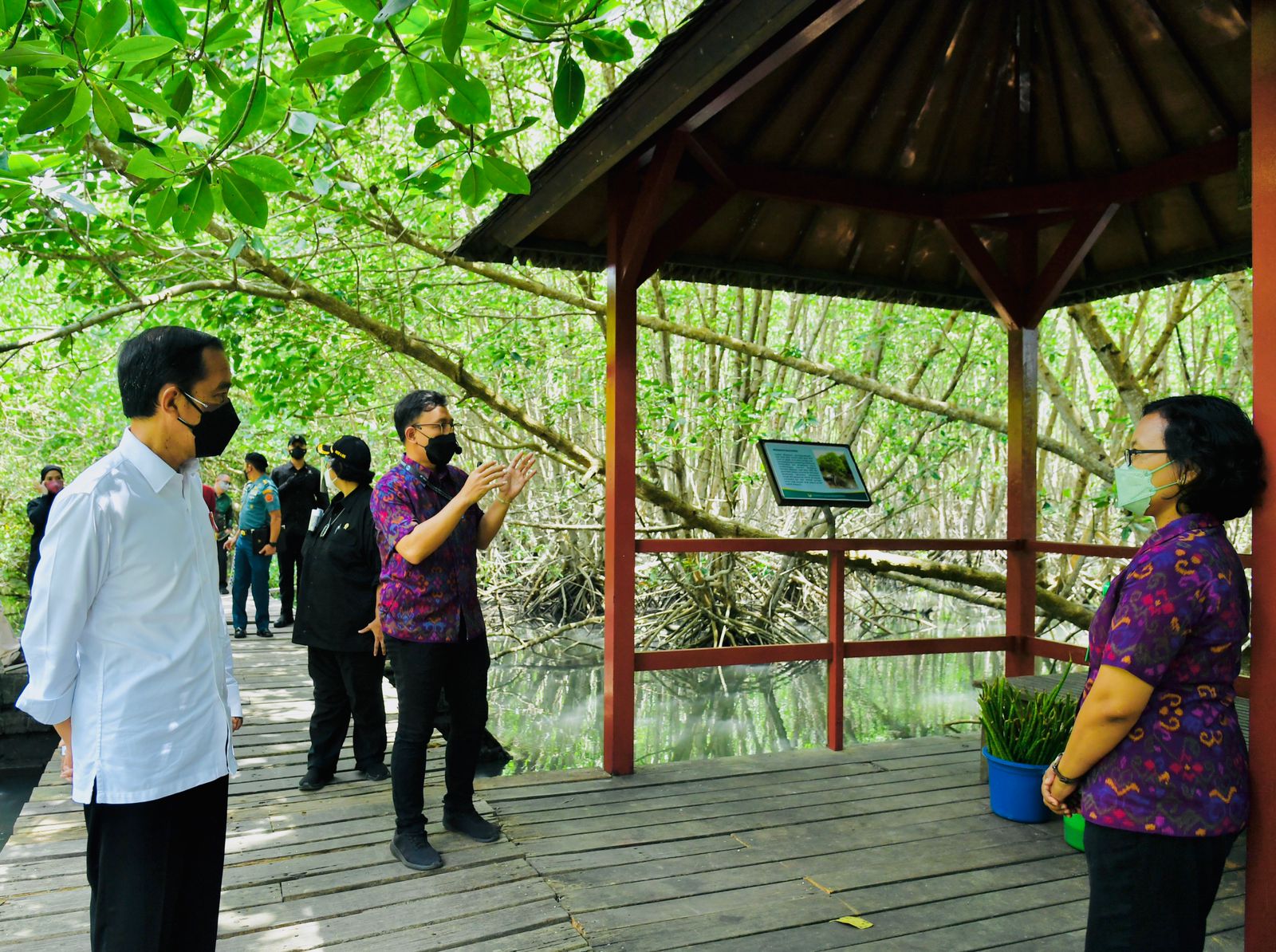 Di Taman Hutan Raya tersebut, Presiden dan Ibu Iriana didampingi Menteri Lingkungan Hidup dan Kehutanan (LHK) Siti Nurbaya Bakar, Menteri Sekretaris Negara Pratikno, Menteri Luar Negeri Retno Marsudi, Kepala Badan Restorasi Gambut dan Mangrove Hartono Prawiraatmaja, Gubernur Bali I Wayan Koster, dan Wakil Menteri LHK Alue Dohong, berjalan kaki di atas jembatan kayu menelusuri kawasan hutan mangrove sejauh 500 meter hingga menara pandang.