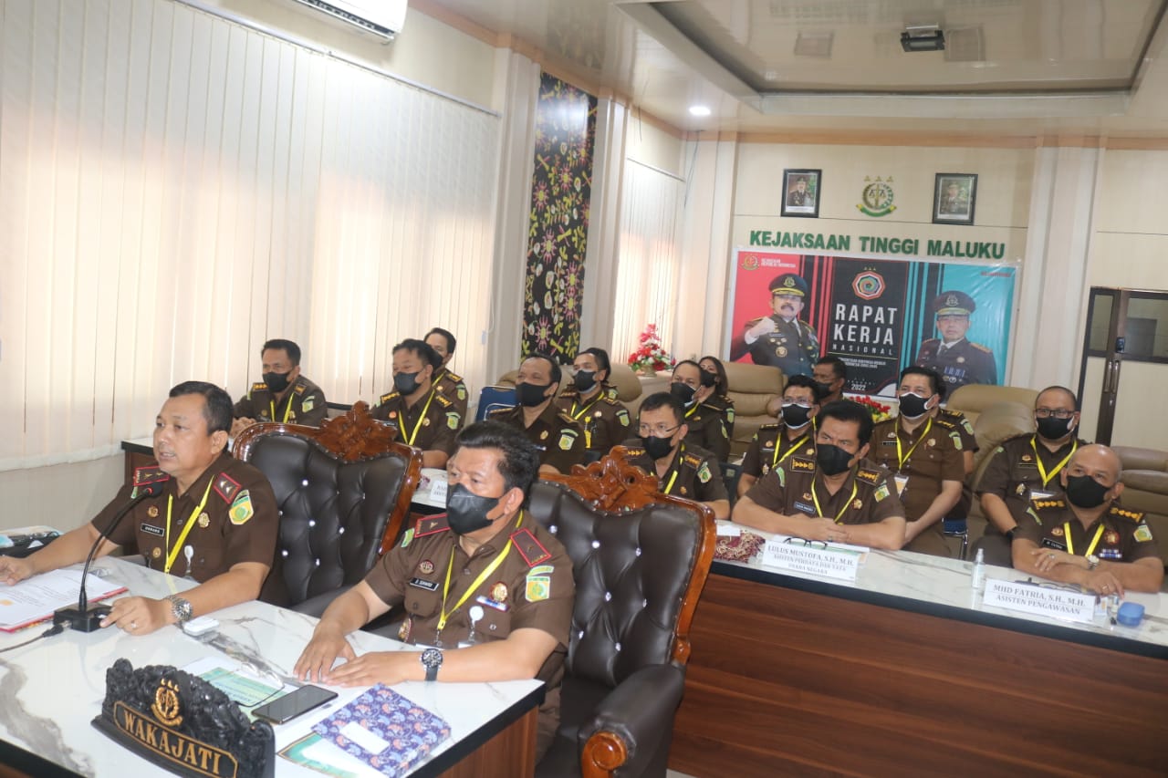 Ambon – Kepala Kejaksaan Tinggi (Kajati) Maluku, DR Undang Mugopal, SH, M.Hum, mengikuti Rapat Kerja Nasional (Rakernas) Kejaksaan RI Tahun 2022 secara Virtual di ruang Rapat Kajati, Kamis (3/2/2022).