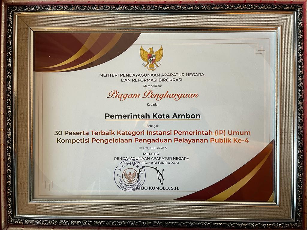 Piagam Penghargaan sebagai 30 peserta terbaik kategori Instansi Pemerintah (IP) Umum Kompetisi Pengelolaan Pengaduan Pelayanan Publik ke-4 diterima Kepala Dinas Komunikasi Informatika dan Persandian (DiskominfoSandi) Kota Ambon, Joy R. Adriaansz, dalam acara penganugerahan penghargaan yang berlangsung di Hotel Ritz Carlton Mega Kuningan, Jakarta, Kamis (16/6/2022).