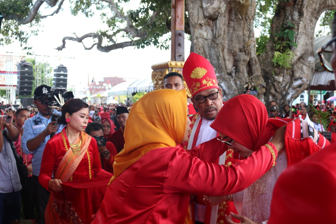 Sedangkan, Ibu Raja Danar, Evi, mengalungkan syal kain tenun berwarna merah khas Maluku kepada Ibu Widya Pratiwi Murad sebagai tanda pengukuhan.