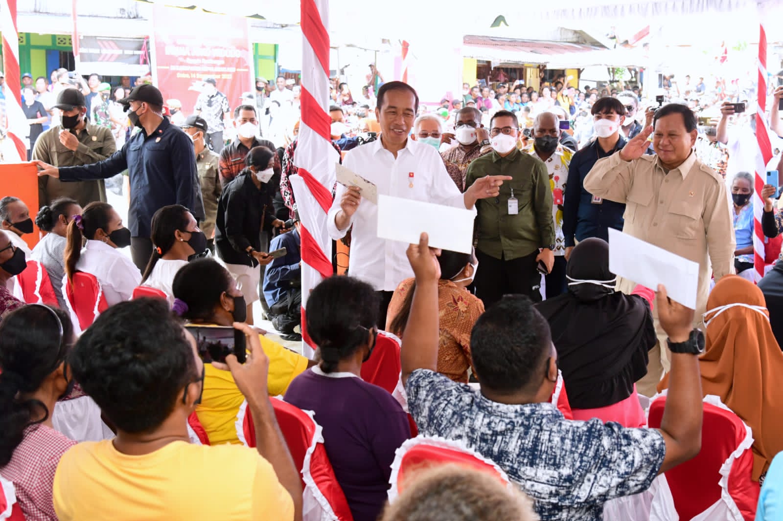 Turut mendampingi Presiden dan Ibu Iriana Joko Widodo di Kantor Pos yaitu Menteri Pertahanan Prabowo Subianto, Menteri PUPR Basuki Hadimuljono, Menteri Kelautan dan Perikanan Sakti Wahyu Trenggono, Gubernur Maluku Murad Ismail dan Bupati Kepulauan Aru Johan Gonga. (K-06)