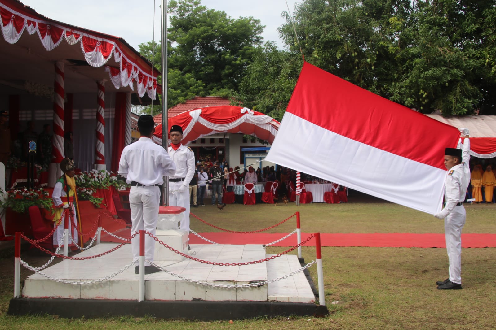 Ambon – Upacara Peringatan Peristiwa Pengibaran Bendera Merah Putih Pertama di Maluku 27 Desember 1949 yang berlangsung di Pelataran Rumah Raja Hitumessing, Kecamatan Leihitu, Kabupaten Maluku Tengah, dilangsungkan, Selasa (27/12/2022). Bertindak selaku Inspektur Upacara, Sekretaris Daerah Maluku, Sadali Ie.