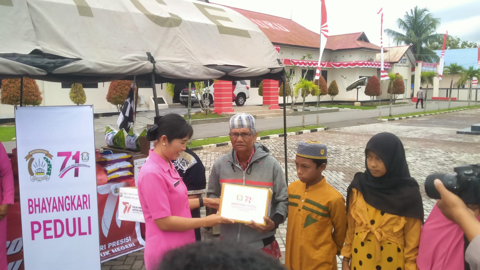 Namlea – Menjelang Hari Ulang Tahun (HUT) Bhayangkara ke- 77 tanggal 1 Juli 2023, Polres Pulau Buru, menyalurkan bantuan sosial (bansos) kepada warga masyarakat yang kurang mampu, di halaman Polres saat apel pagi, Senin (19/6/2023). Kegiatan itu juga dihadiri  ketua Bhayangkari cabang Pulau Buru, Ny Rika Ruben Sihombing.